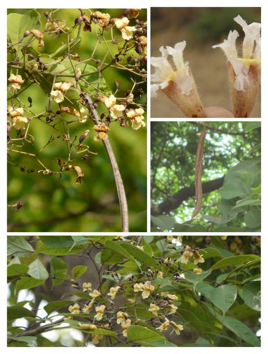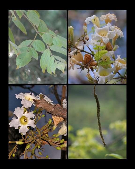 Dolichandron falcata is a small deciduous tree with bluish-gray bark. Peeling in irregular woody scales. Leaves are compound, leaflets are obovate. Flowers are white borne in mostly 1-3 flowered corymbs.
