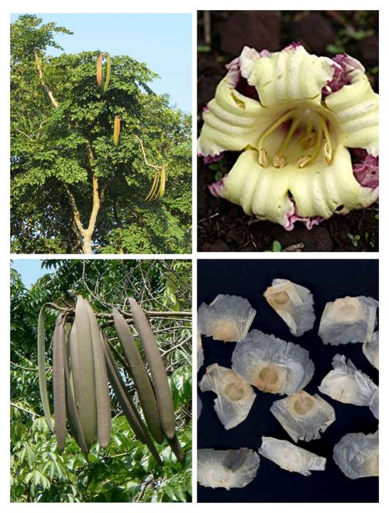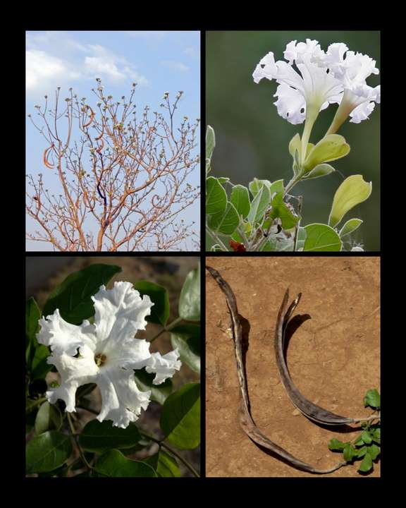 It is usually found in dry deciduous forests of Central India. It is a rare species in the central Indian region with very thin and scattered population.it is widely cultivated as ornamental, for the showy flowers. Leaves are bipinnate, leaflets are elliptic, oblong sharp-tipped with a rounded base. Flowers are white, funnel-shaped.
